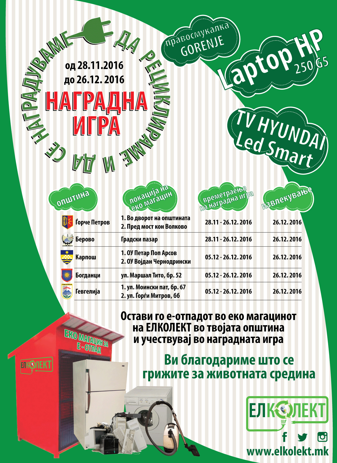 февруари 8, 2024 ЕЛКОЛЕКТ ЗАПОЧНУВА СО НОВ ЦИКЛУС ОД НАГРАДНАТА ИГРА „ДА РЕЦИКЛИРАМЕ И ДА СЕ НАГРАДУВАМЕ” ЕЛКОЛЕКТ ЗАПОЧНУВА СО НОВ ЦИКЛУС ОД НАГРАДНАТА ИГРА „ДА РЕЦИКЛИРАМЕ И ДА СЕ НАГРАДУВАМЕ” Елколект започнува со третиот циклус... ПОВЕЌЕ