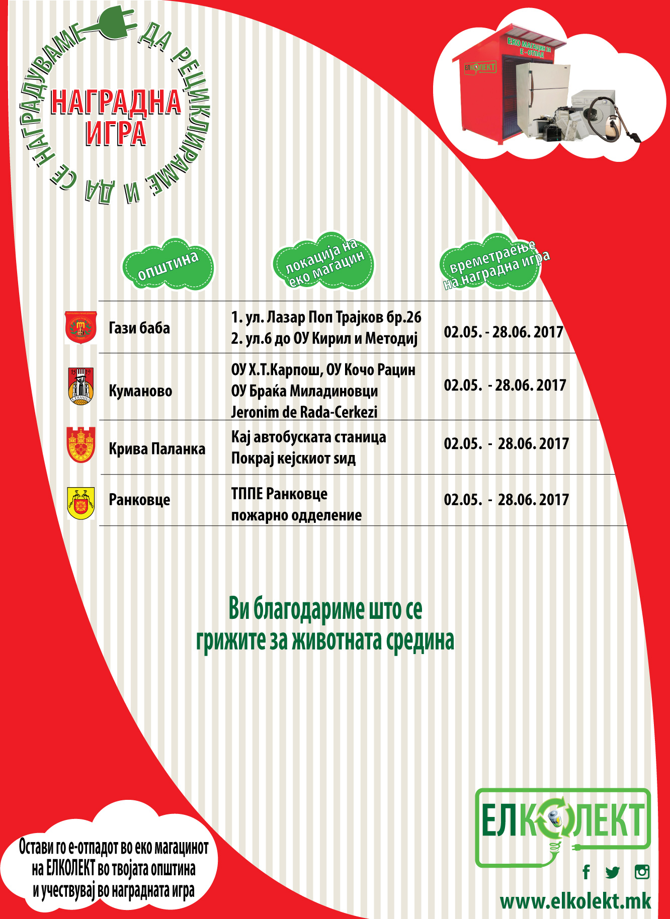 февруари 8, 2024 ЕЛКОЛЕКТ ДОО – Скопје, награди 20 учесници во наградната игра од Општините: Гази Баба, Куманово, Крива Паланка и Ранковце ЕЛКОЛЕКТ ДОО – Скопје, награди 20 учесници во наградната игра од Општините: Гази Баба, Куманово, Крива Паланка и Ранковце... ПОВЕЌЕ